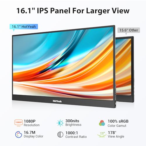 Discover the convenience of the HotYeah Portable Monitor, designed to enhance your work, gaming, and travel experiences. This 16.1-inch 1080P FHD display with a 178° viewing angle and 72% NTSC color gamut offers superior color accuracy and immersive visuals. The low blue light technology ensures reduced eyestrain for comfortable extended use.